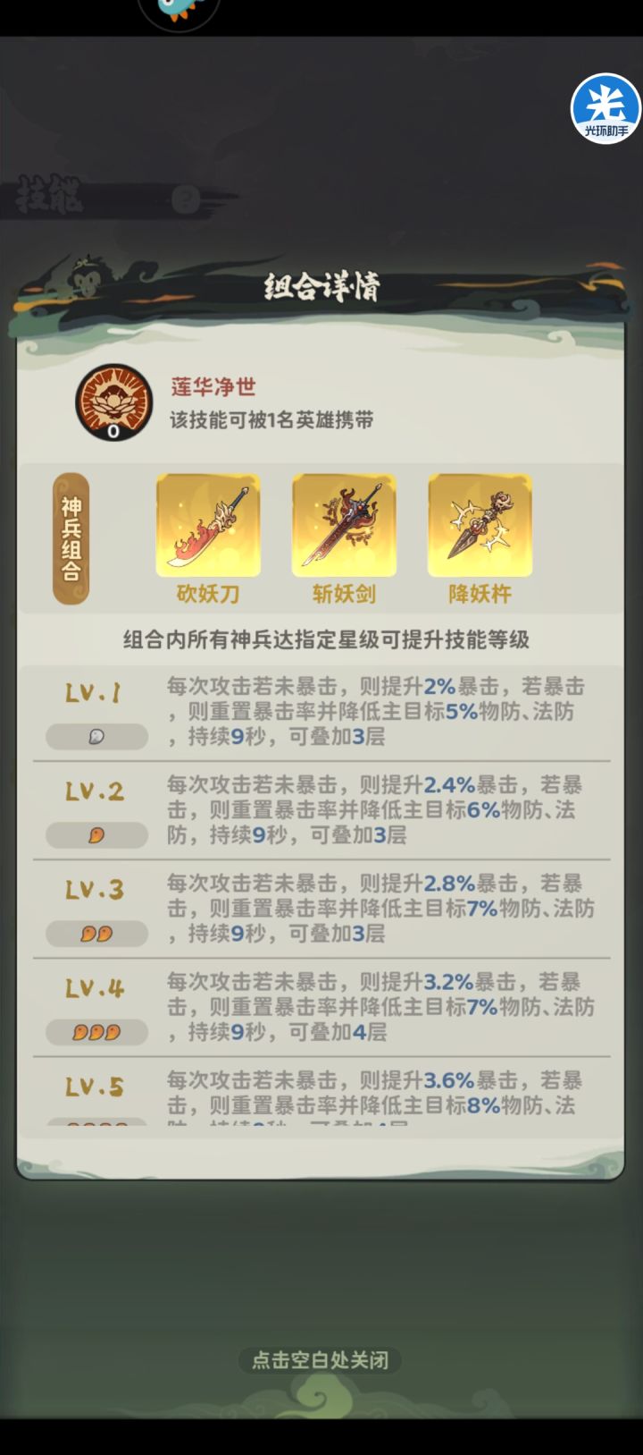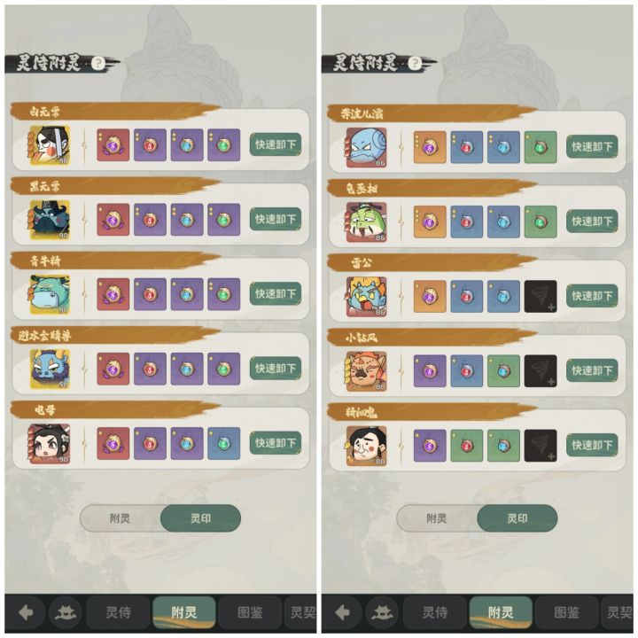 接上文。图1-2.灵印界面,可以看到类似英雄佩戴法宝,灵侍可以佩戴灵印,灵印共4种,雷、水、火、风分别加攻击、物防、气血、法防,具体数值见图2,佩戴后总体战力增加与灵印显示提供的战力有一定差别,具体系数有机会单开贴。可以看到灵印可以合成,3个低级灵印合成高级灵印,数值仅增加36%左右,故而优先让灵侍把灵印带满再考虑合成更高级灵印。图3.为附灵,即把灵侍给英雄"佩戴"上,附灵后英雄拥有灵侍技能。