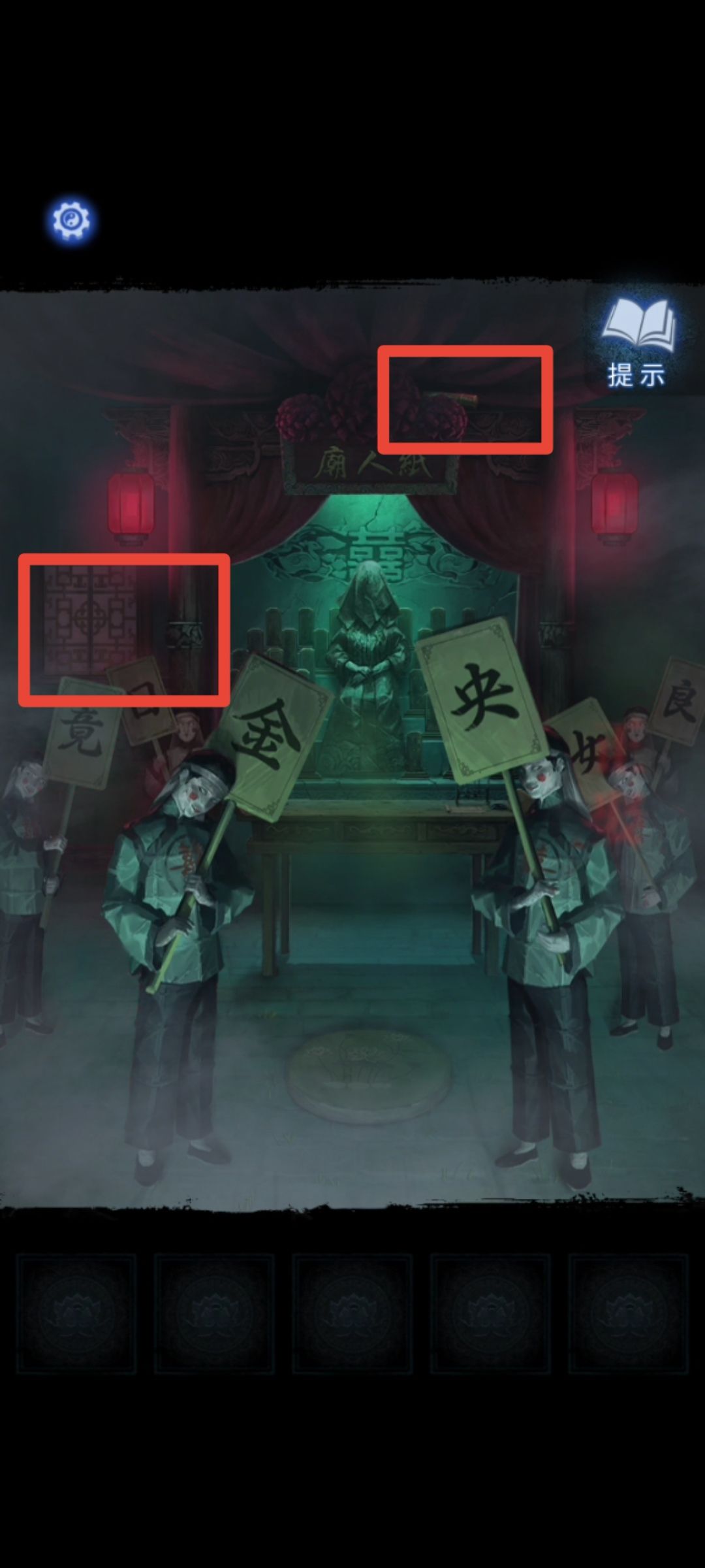 过剧情,点击牌匾,获得龙凤花烛 飞过窗户,获得朱砂香囊 切地图,点击桌子,获得剪刀 点击门后,将龙凤花烛插在台子上,根据墙上的资料点燃对应蜡烛,喜的句子灭蜡烛,悲的句子点蜡烛,点完后获得梳妆镜和无面铜人 切场景,把梳妆镜摆在供台上,获得盖头 过剧情,切场景,用盖头点击门,做小游戏,在两人重合时点击道具即可 进屋,根据纸人庙窗户后木牌上的资料,切换雕像,获得瓷器娃娃和木雕少女 切场景,将木雕少女放在