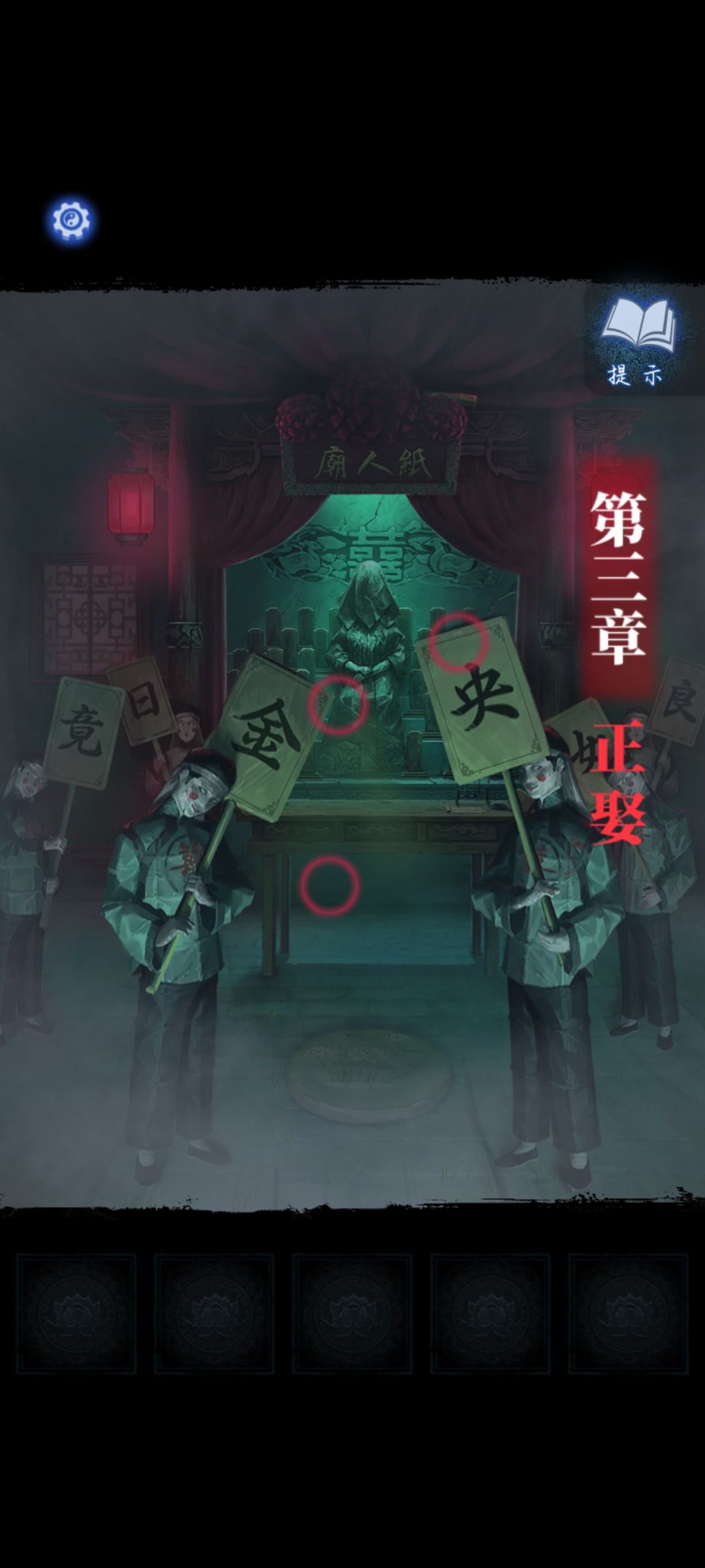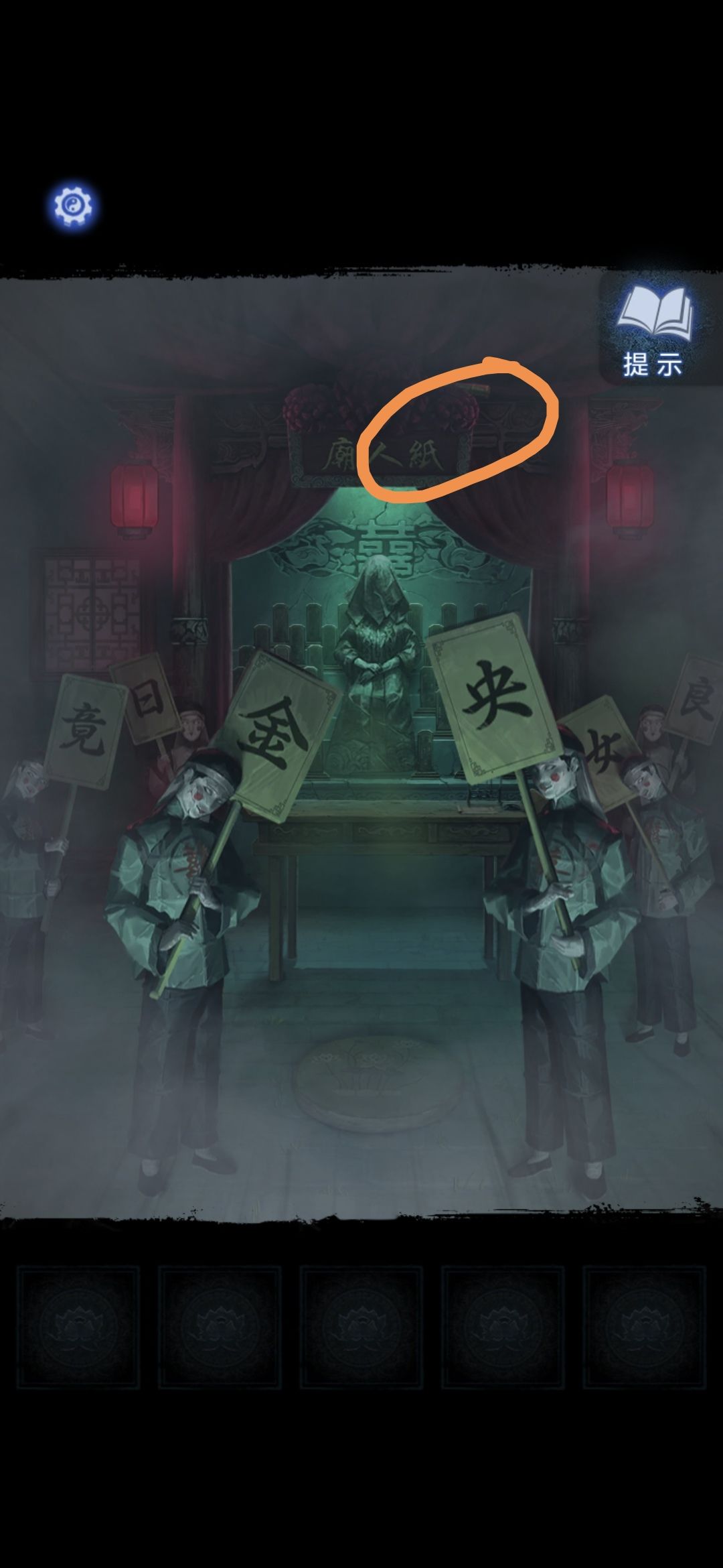 相关攻略: 1. 在纸人庙中,先点击纸人庙牌匾右侧上方,得到【龙凤花烛】。返回后点击左侧窗户,对话结束后来到祈福树前,拿走【朱砂香囊】并记下每一个牌子上的乐器符号和字符。 2. 按照剧情走向,从地图中进入六礼轩。先拿走桌上的【纸扎剪刀】,然后检查六礼轩的神像、屏风、抬礼的纸人和房顶上吊着的神龛。 在神龛这里放上【龙凤花烛】,直接向左拉动,在最左的神龛下方可以看到点蜡烛的提示之一,然后结合神龛两边