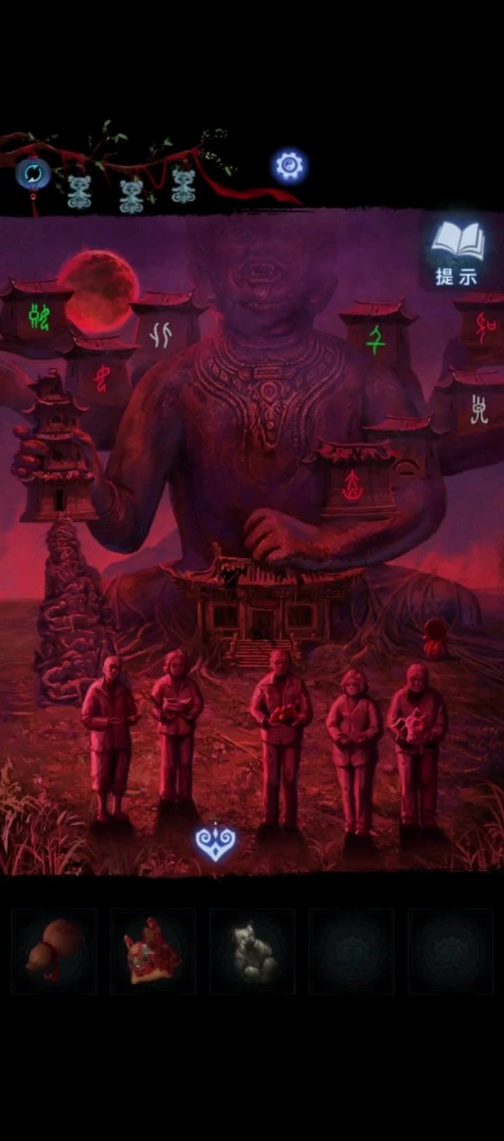 || | 第五章:不离 🧸聂莫琪视角 [千子树] 1.点击树上的灯笼,完成小游戏 🔶将灯笼全部点亮 2.拾取掉落的【灯笼】和神龛里的【泥塑头像】 ……✄……✄……✄……✄……✄…… [雕像] 3.将【灯笼】挂到村民手上的棍子上,触发剧情,观察石像村民手中捧着的供品 🔶注意小屋墙上画着的奇怪的符号 🧸聂莫黎视角 [千子树] 4.点击查看挂在树上的剪纸娃娃 5.点击日晷,获得【铃铛】 ……✄……✄……