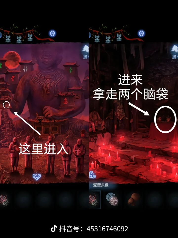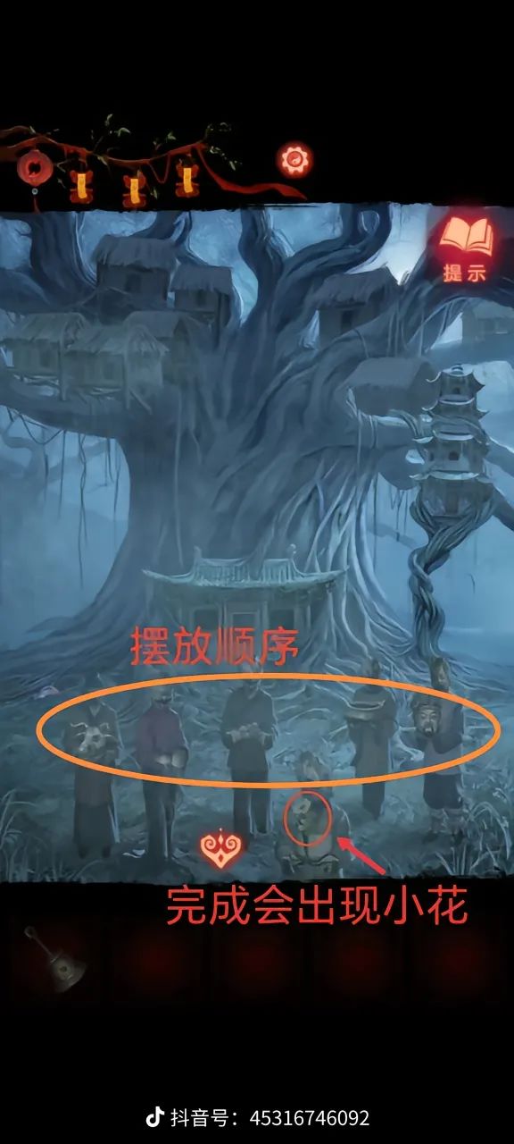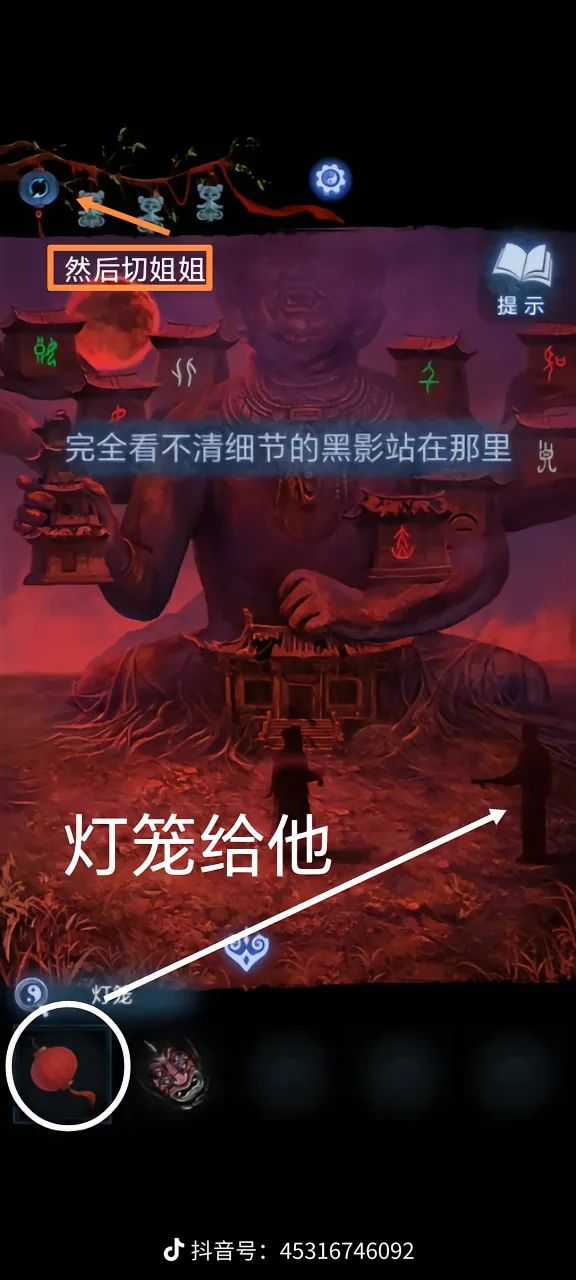 持续更新解谜游戏攻略,欢迎点赞关注①:开头按照这个顺序点亮灯笼②:聂莫琪视角,捡起地上的红灯笼和面具,将灯笼给大佛像下的人,可看见五个人抱着不同的东西,分别是头 香炉 水果 葫芦 猪头③:聂莫黎视角,可在大树边的日晷上捡到铃铛,根据镜像改变聂莫黎视角五人手上的贡品,获得一束花,聂莫琪视角获得泥塑头像和酒葫芦(点击五人手上的贡品)。④:聂莫黎的花插在树下的铜钱上,出现一个罗盘,