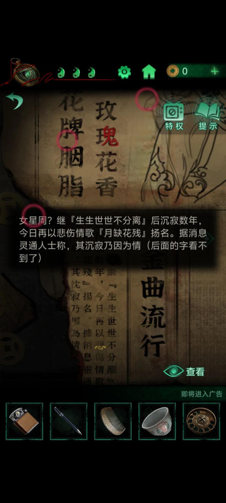 过剧情,点击牌匾,获得龙凤花烛飞过窗户,获得朱砂香囊切地图,点击桌子,获得剪刀点击门后,将龙凤花烛插在台子上,根据墙上的资料点燃对应蜡烛,喜的句子灭蜡烛,悲的句子点蜡烛,点完后获得梳妆镜和无面铜人切场景,把梳妆镜摆在供台上,获得盖头过剧情,切场景,用盖头点击门,做小游戏,在两人重合时点击道具即可进屋,根据纸人庙窗户后木牌上的资料,切换雕像,获得瓷器娃娃和木雕少女切场景,将木雕少女放在
