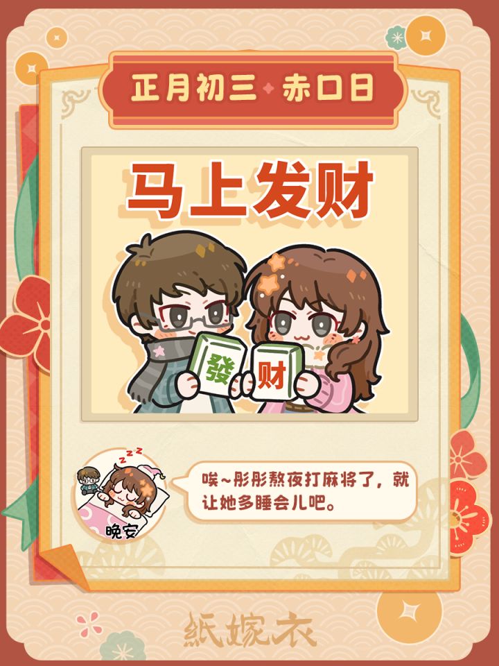 正月初三,又称“赤口日”。“赤口”即有口舌之争的意味,古时候大家为了避免过年产生纠纷,年初三都会专心待在家中,既不会出门拜年,也不会邀请宾客来访。“唉~彤彤熬夜打麻将了,就让她多睡会儿吧。”那就顺应习俗,一起在家好好休息吧~!(´-ωก`)☡zᶻ
