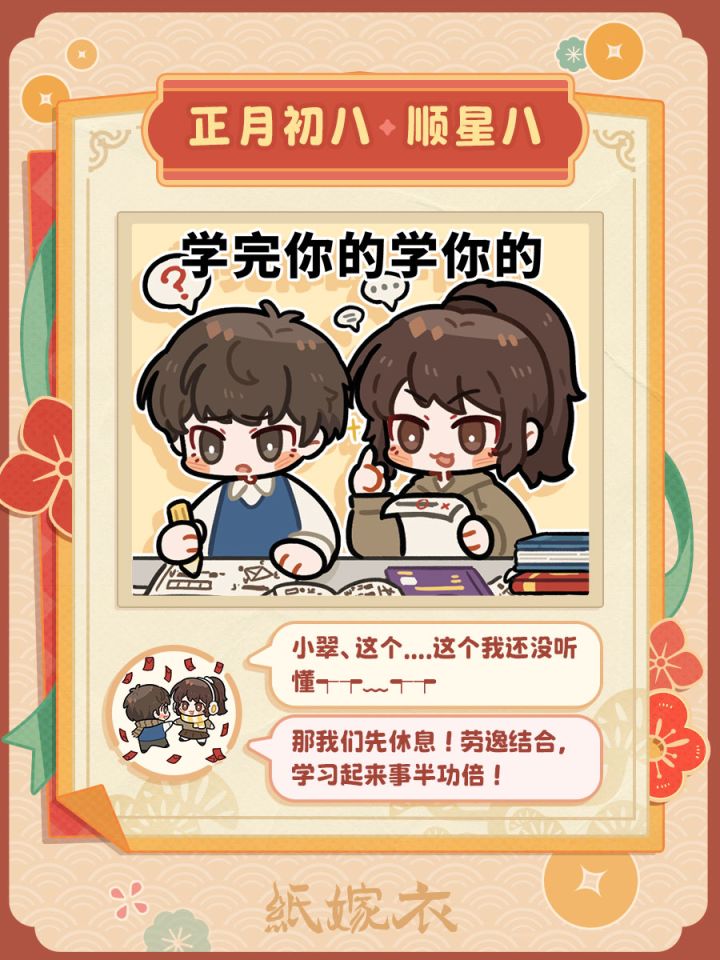 正月初八是“顺星节”,传说中众星下界的日子。人们会在夜晚点燃灯盏祭祀星宿,以求新岁安康自在。这天亦被视为“谷日”,如果天气晴朗则预示新年稻谷丰收。不仅如此,初八这天通常也是大家复工的日子,阿纸也已经在工位上为大家筹备纸9咯(做完你的做你的.jpg)“小翠、这个....这个我还没听懂┭┮﹏┭┮”“那我们先休息!劳逸结合,学习起来事半功倍!”希望纸迷们在新的一年里,多多关心自己,时刻调整状态,