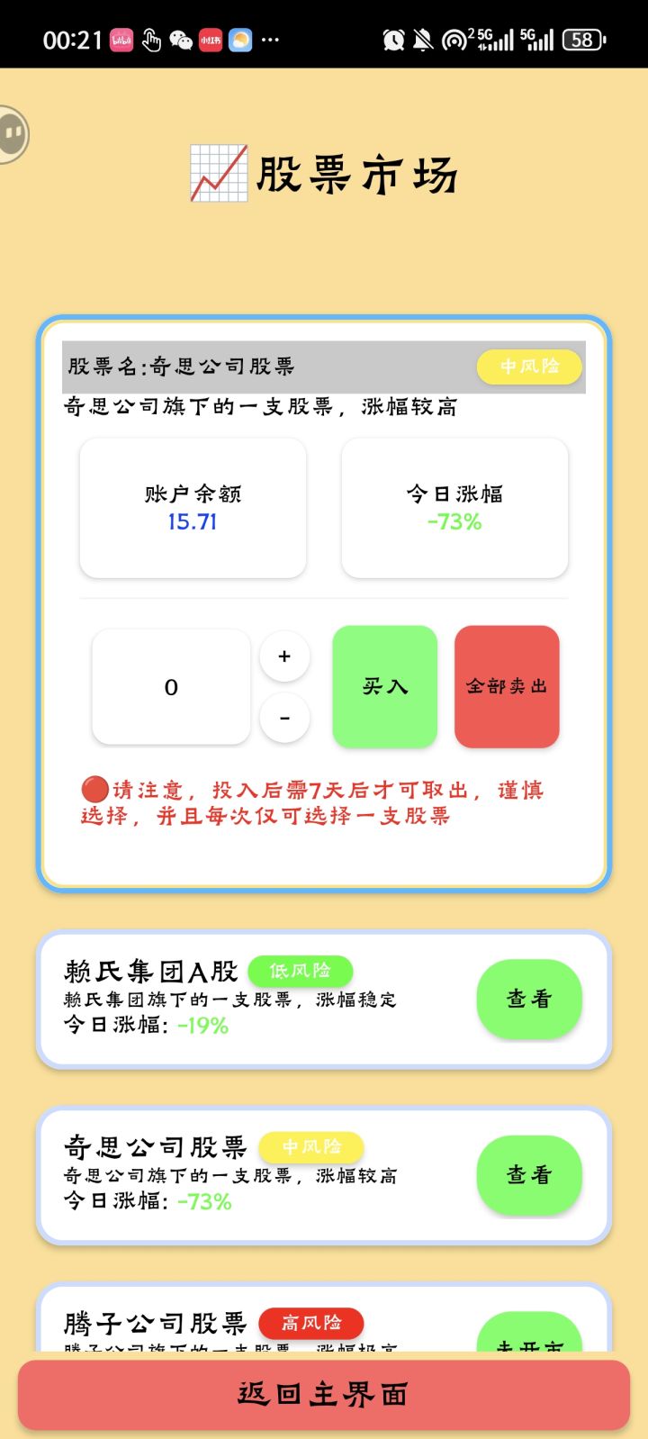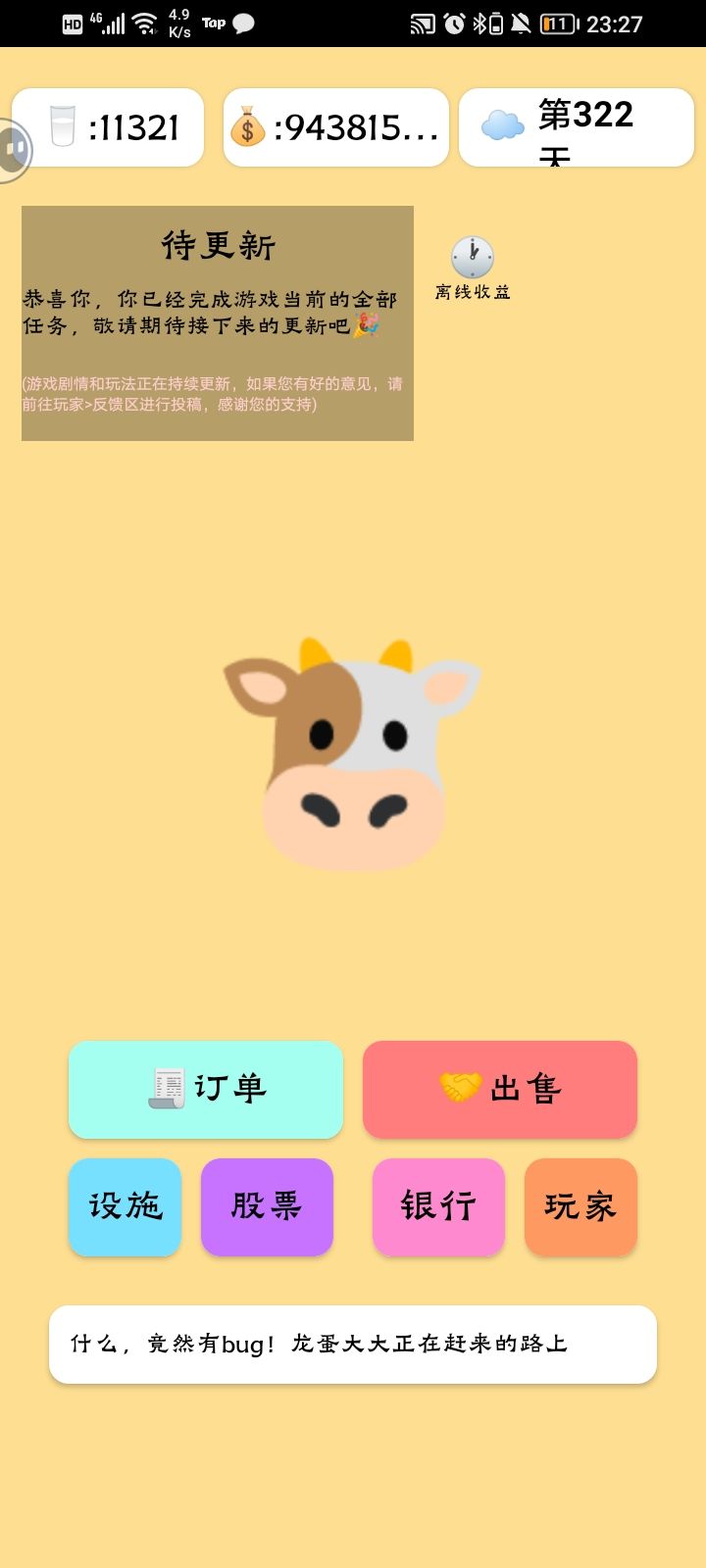 确实让我玩了很久,但也发现了一些问题,一是随机事件可能会出现牛奶暴涨到1.8的时候,但这时候我最低价也超过1.8了,是不是暴涨时间可以考虑一下变成现有市场价格固定倍率,而不是固定价格呢?