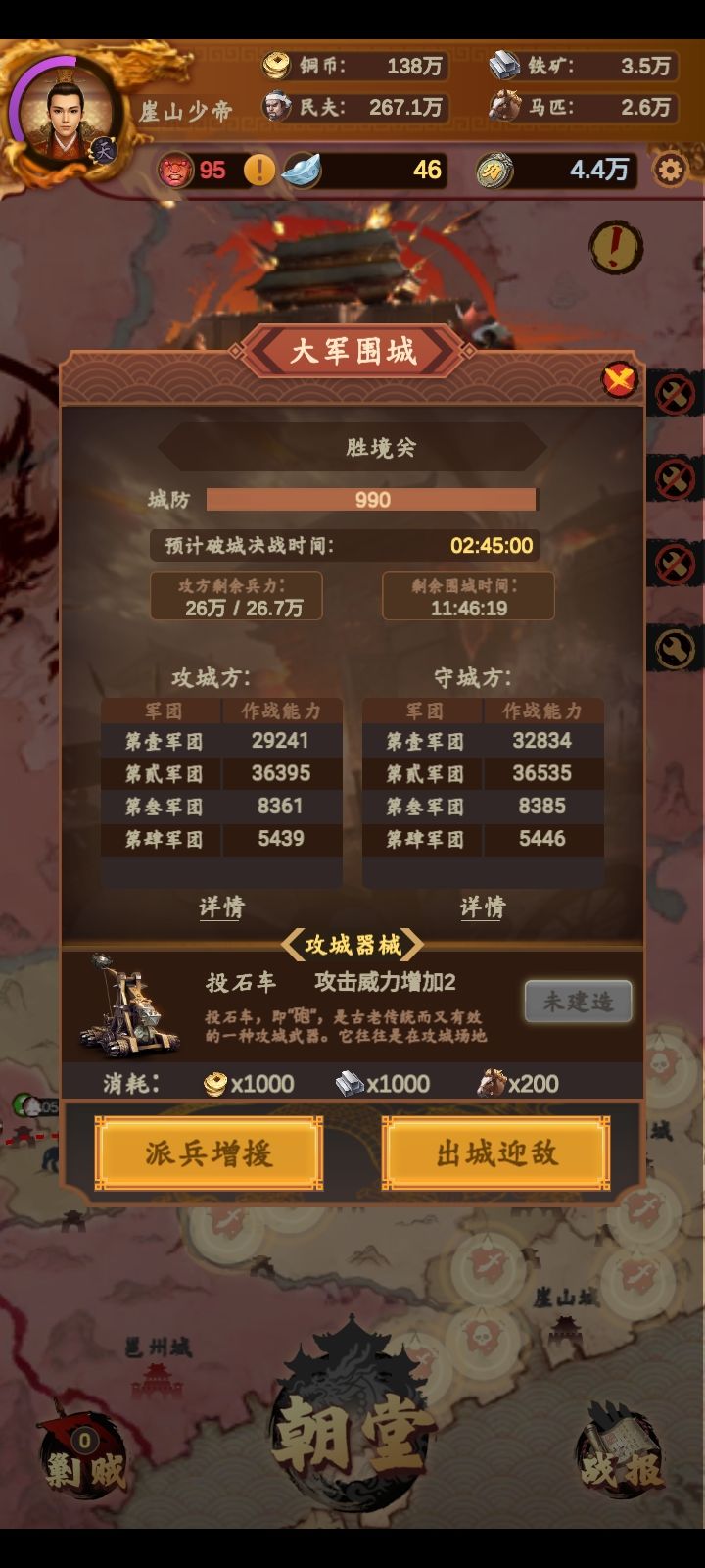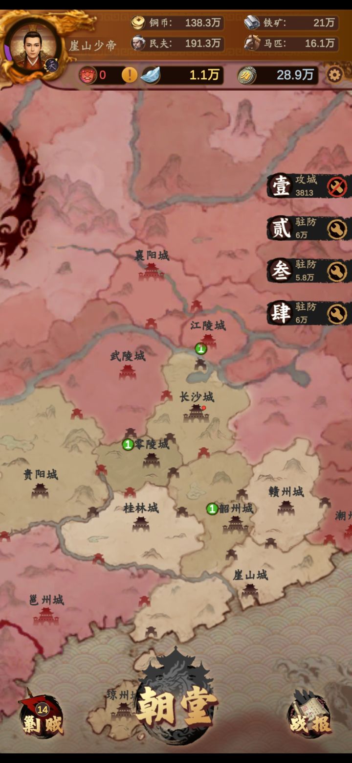 感谢殿下及各位侠义之士测试版上线以来向我们反馈的诸多问题,如今,《挂机皇帝:抽卡定中原》的第二次测试已经可以为殿下呈上来了,在第二次测试中,有以下新增内容:1.加入了更多城市。在第一次测试中,我们成功收复了襄阳城,这一次该向着长安和建康,再度北伐了。2.加入了【内政】系统。殿下如今可以通过翻新都城宫阙,获得一些全局性的增益。3.加入了【寻宝】系统。正所谓“好马配好鞍,好船配好帆”,神将们的遗