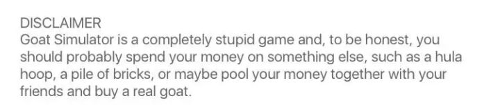 打开《山羊模拟》的第一秒,你看到的不是画面多么震撼,而是粗糙到扎眼的贴图,讲究一个丑到极致就是style。开发者也写在开头了“不如把这钱花在别的地方,比如买只真山羊”。人家都写在前面了,定向筛选一身反骨的沙雕玩家,我觉得买了就没必要后悔。