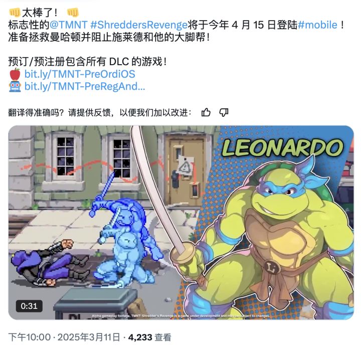 🚩游戏类型:多人联机、动作、角色扮演🌋游戏介绍:在这个渲染精美的复古清版动作游戏中,在一系列正义的经典忍者神龟地点中大打出手。闯过十几个不同的关卡,使用危险的忍者连击击败巴克斯特斯托克曼或三角龙等经典敌人!💥游戏于4月15日海外上线免费试玩,感兴趣的小伙伴可以点击评论区上方的游戏链接【预约】关注,方便第一时间掌握游戏测试相关资讯动态。#发现好游戏 #游戏安利 #游戏推荐 #游戏种草计划 #游