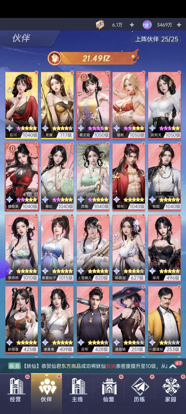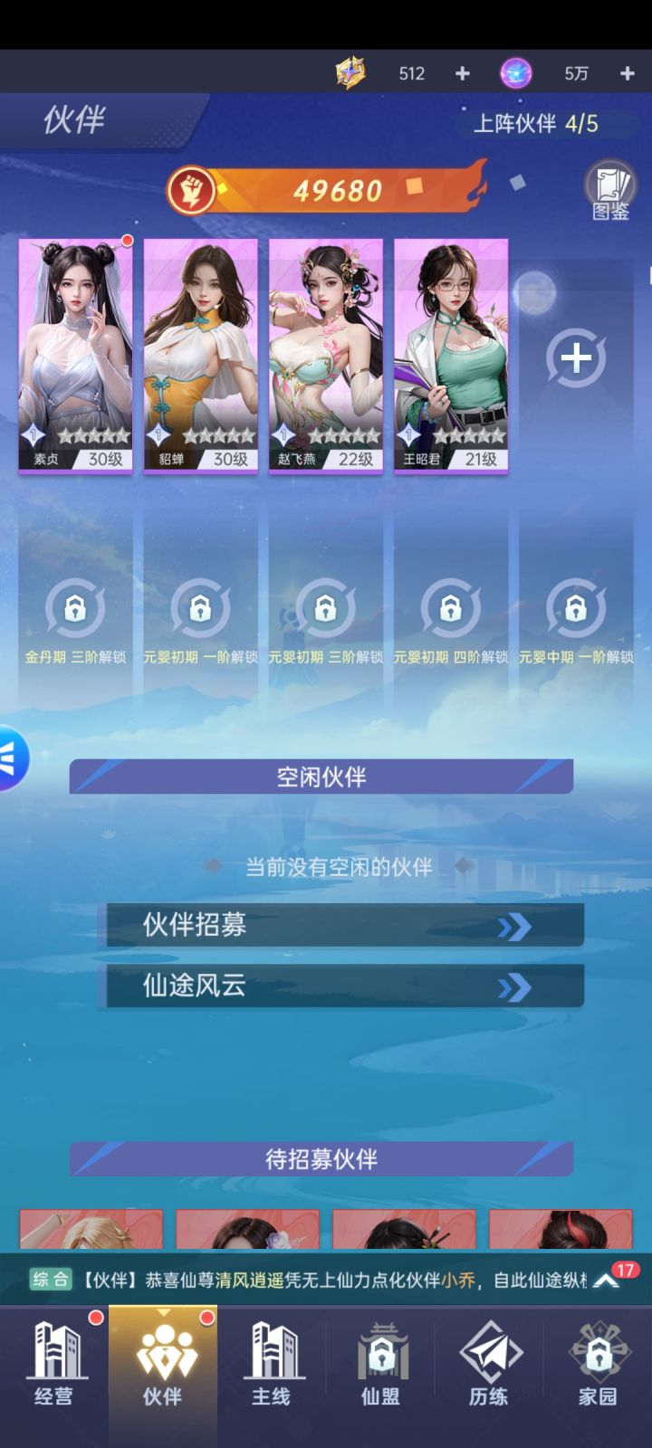 伙伴总计42名,女性角色居多,同卡牌游戏一样有品级、职业、阵营设定。上阵最大10名,格子需境界等级解锁。单角色有等级、星级、命格、座驾、秘书几条养成线,每个店面内的每个设施都需要进驻伙伴,与其他模拟经营游戏设定相同。能力越高对其加成越高,对于高品级不同伙伴一直有需求,促进了抽卡。