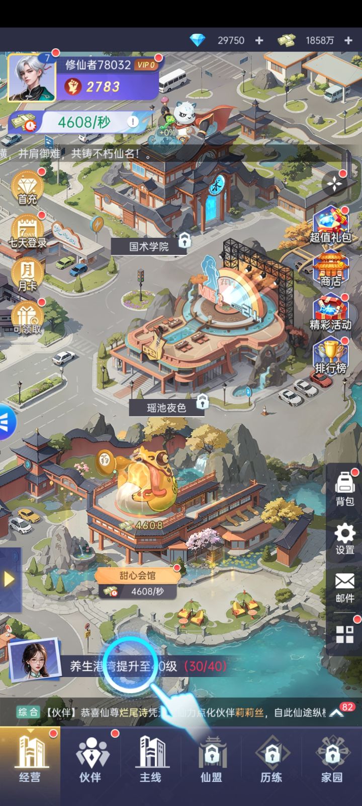 游戏把都市经营和修仙的元素融合的很好,画风很不错把古风和现代都兼顾了,特别是人物的立绘做得都非常精致。游戏的福利还挺多而且对零氪党也很友好。游戏主要就是以仙尊的身份,招募许多美女伙伴来给你打工,帮你赚钱,你在里面还可以过剧情,和美女们交流,也可以钓鱼,历练,玩法确实很丰富了。
