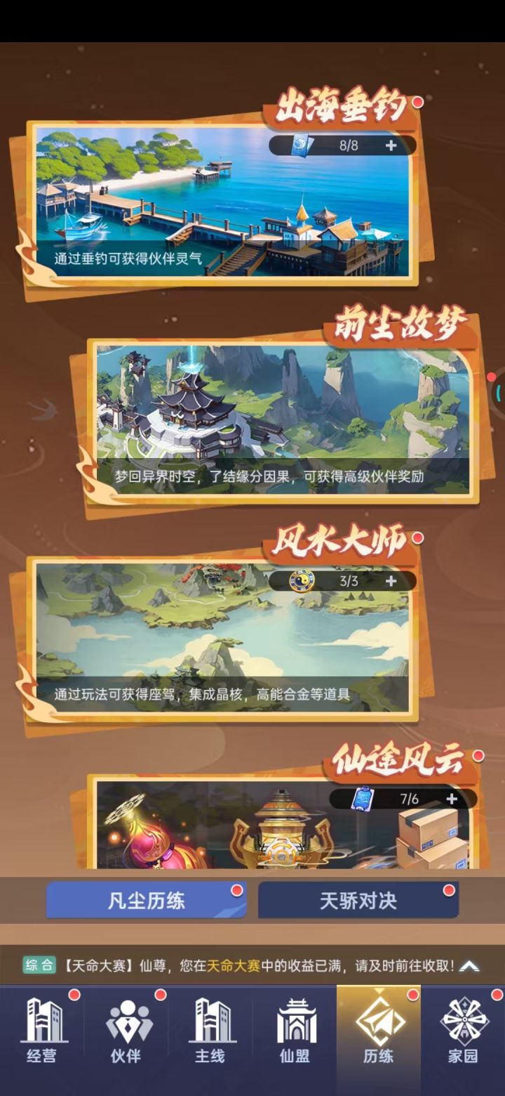 有战斗内容,只是简单的数值比拼,过程没什么看点。在天命大赛可以挑战其他玩家镜像,类似竞技场的功能。其他扩展玩法在历练界面,内容很丰富,如钓鱼这种休闲玩法也在其中。
