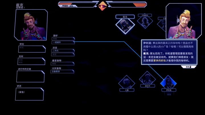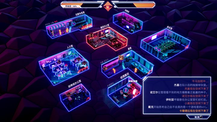 每回合结束后人物的状态会刷新变化。有些状态描述很有趣,比如说戴克开始思考自己会不会真的是一个游戏里的NPC、杰基正在开发一款名为《狂扁大老板》的独立游戏。如果人物处在忙碌的话,会无法操控和互动。不过忙碌状态的人可以通过夺命连环call来恢复为空闲状态。