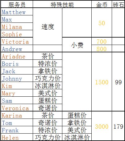 红色为女性,蓝色为男性,带有价为提升该类商品价格,未有则为大师级产出时间减少,香料需要先升1级点出该技能则每天给1~3个(看等级),销售是有百分比成功率推荐商品,单一技能不能超过雇员等级,就这么多 在这里说一下,雇员被炒鱿鱼了再召回等级不变,但重新付钱
