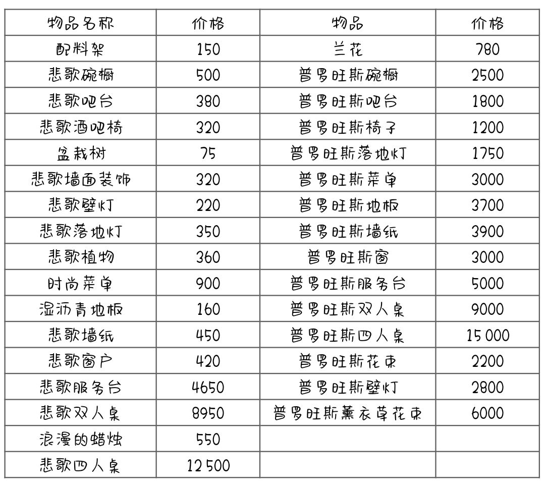 欢迎查缺补漏,目前才玩到13级很多东西都没解锁。买了的装饰又查看不了价格。 弄个表方便寻找