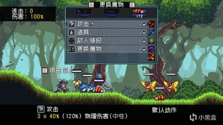 而《Monster Sanctuary》的魔物之间也有着这样的属性相克机制,并且在开战前的备选阶段,每只魔物的不利属性和有利属性都会被标出(这里的不利与有利说的是对属性的伤害抗性)。比如下图之中可以看到左边的一行魔物“苍鸦”旁边有三个小图标,最上边的红色箭头指的是魔物的不利属性,也就是如果我用“风”属性的攻击手段来攻击“苍鸦”这类的精灵,那么我的这个攻击手段会在它原本的伤害基础上造成额外伤害,而像盾牌一样的图标,则代表了苍鸦的有利属性是“风”属性,敌方如果用“风”属性的攻击手段来对“苍鸦”造成伤害,那么这个伤害会被额外削减一些,至于第三行那个剑的图标,则代表了“苍鸦”的普通攻击以及大部分技能类型都带有“风”属性。这三个魔物的基本属性在战斗中是十分有用的,利用好这三个基本属性,在《Monster Sanctuary》之中才能精准狠戳敌人的弱点,并且使得自己能有效打出最大化输出(这个属性相克机制在我看来是比较有“宝可梦”感觉之一的要素)。