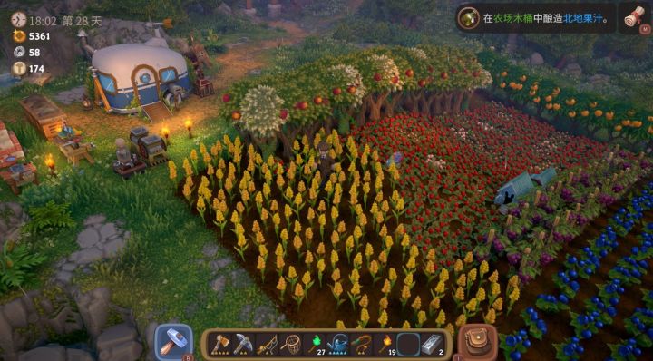 干了的耕地会有黄沙般的尘土效果提醒你该浇水了;起风的时候树叶会从树上掉落;夜晚来临时我们建造的小屋会自动亮起温馨的灯光(上面的风车还会慢悠悠地转)...这些细节会让你觉得这个世界是灵动的,很多种田玩家就喜欢这种温馨氛围感。