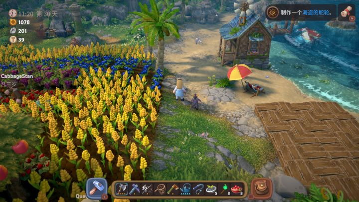 当然,这个小屋花掉了我们巨多资源,但没人能拒绝从简陋的房车搬到海边的小套房里。游戏还有别墅,我们四个人11个小时实在肝不出来,连材料都没见过,大概是要再后期一些的东西。我们看着刚建好的农舍,想象着未来搬进别墅的样子,又一次欣喜地投入到了种田挖矿里去。