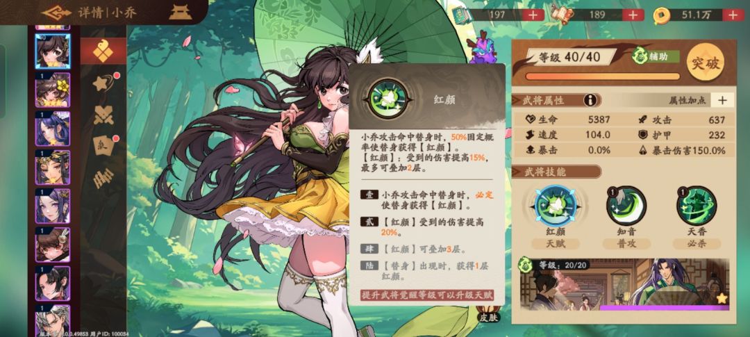 对于小乔妹妹的培养,可以看到被动这边是靠普攻触发的,所以在打南蛮入侵的时候,对单输出(关羽这种)带的情况下,可以给小乔锦囊搭配一个借刀杀人用来更加快速触发。然后正常搭配或者说和群伤配队的话就是配上无中生有就可以了#三国杀武将觉醒 #三国杀武将觉醒角色养成