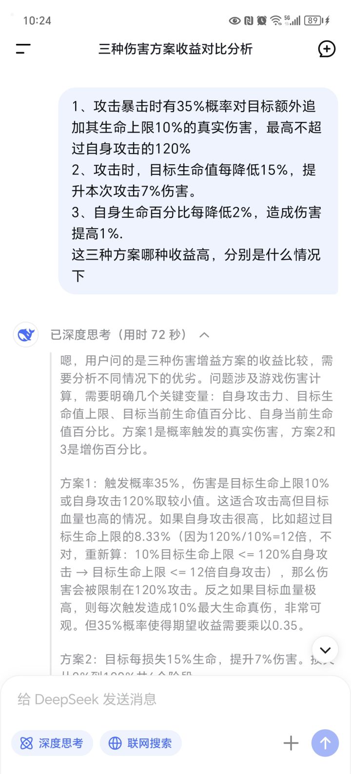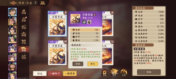 1、万箭齐发:攻击暴击时有35%概率对目标额外追加其生命上限10%的真实伤害,最高不超过自身攻击的120%2、决斗:攻击时,目标生命值每降低15%,提升本次攻击7%伤害。3、破釜沉舟:自身生命百分比每降低2%,造成伤害提高1%.直接说结论:暴击40以上万箭齐发的收益已经高过另外两个锦囊了,更高的话差距会更大。更何况追加的还是真伤,懂得都懂。无脑选万箭就行了。最后一张是ai自设的场景,感兴趣的