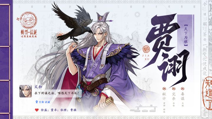 各位主公大家晚上好呀~我是你们的小杀妹妹!在接下来的时间里,我将会给各位主公们分享最新版本中新角色的技能及阵容玩法攻略哦~也欢迎各位主公在评论区留下您对新角色的玩法感悟&建议哦!今天介绍的是我们的贾文和 - 贾诩!我们依然是按照技能介绍、溯影专武推荐、锦囊推荐、阵容推荐来一一说明~ 一、技能介绍(以下技能以满级为例) 天赋 — 乱武先发制人,毒计破敌!普攻 — 献计攻击敌方目标,对