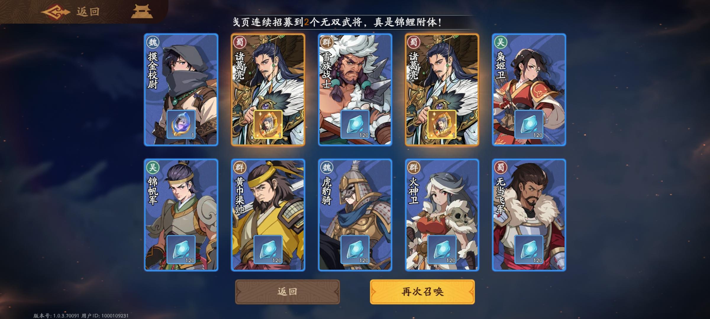 放在开头,这次参加测试主要还是奔着ip来的。三国杀作为一款不错的易上手难精通的桌游还是很适合推新的,话说实体桌游我给游卡贡献了也不是一点点了 好了言归正传,此次游戏最大的体验就是游戏还是个半成品,要提升的还有很多。首先是界面切换,各个活动和战斗进图都会有比较大的卡顿,非常影响游戏体验,后续优化得进一步跟上;第二抽卡概率(可能因人而异)一共出过三次双黄,其他都是保底,抽卡体验比较差