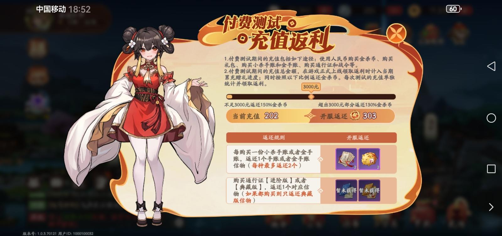 放在开头,这次参加测试主要还是奔着ip来的。三国杀作为一款不错的易上手难精通的桌游还是很适合推新的,话说实体桌游我给游卡贡献了也不是一点点了 好了言归正传,此次游戏最大的体验就是游戏还是个半成品,要提升的还有很多。首先是界面切换,各个活动和战斗进图都会有比较大的卡顿,非常影响游戏体验,后续优化得进一步跟上;第二抽卡概率(可能因人而异)一共出过三次双黄,其他都是保底,抽卡体验比较差