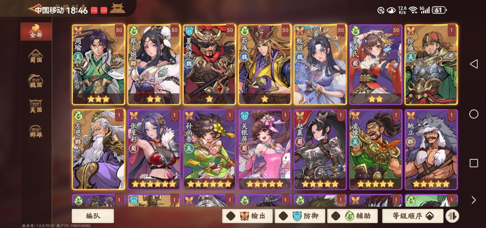 如图,本次测试刚来玩,氪了两个大小月卡加一个六块首充,卡池方面就是新手给的周瑜,心愿抽的蔡文姬夏侯惇荀彧,活动抽的甄姬以及商店换的左慈,现在打下来基本上就是抢先手(蔡文姬,陈宫拉条,何太后推条,左慈复制女性技能),所以只要自己有一个比较高的一速,体感是不错的。然后,徐盛不加强的话,首充三选一不建议选,徐晃和荀彧还可以,我选的荀彧甄姬和关羽建议二选一拉,PVP关羽更厉害,PVE甄姬更厉害周瑜是