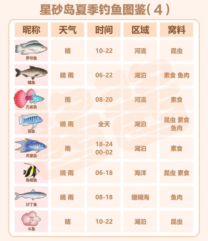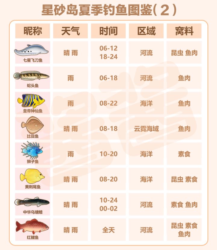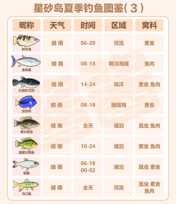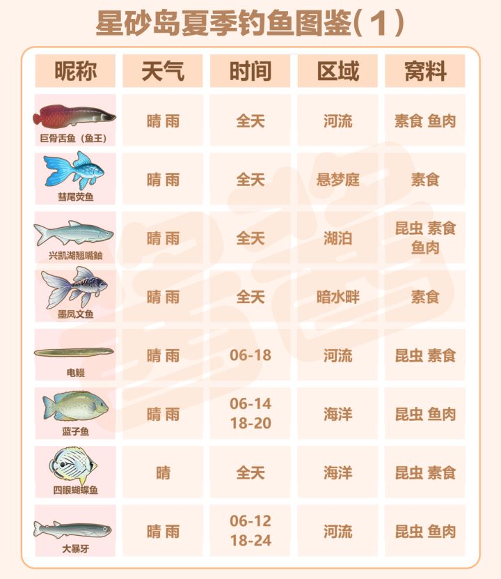大家好,这里是酱酱,本期星砂岛物语夏季钓鱼全图鉴攻略!为了方便大家全收集,我整理了夏季所有37种鱼的详细信息,包含鱼王、出没天气、活跃时间、分布区域、推荐窝料,直接对照即可高效钓鱼!1. 淡水区域(河流/湖泊/悬梦庭/暗水畔) - 悬梦庭:彗尾荧鱼- 暗水畔:墨凤文鱼- 河流:巨骨舌鱼、电鳗、大暴牙、七星飞刀鱼、蛇头鱼、中华乌塘鳢、红鲤鱼、射水鱼、马口鱼、罗非鱼、孔雀鱼-