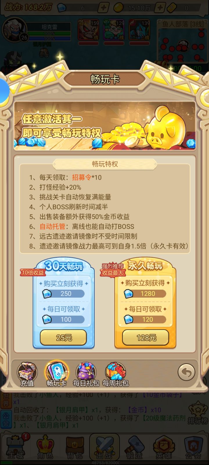 而为什么说是半挂机游戏呢?因为你氪金畅玩卡和没有畅玩卡那几乎是两个游戏,没有畅玩卡你挂机几个小时上线你会发现资源产出微乎其微,而有畅玩卡个人BOSS时间减半,还能离线自动打BOSS!一天下来光是挂机的产出差距就非常之大,当然!逼氪是可以理解的,毕竟要生存,不氪也可以玩,无非就是半个小时上线一次轮一遍个人BOSS罢了,但是对于一个没有深度的游戏而言,128永久畅玩卡性价比在哪里?