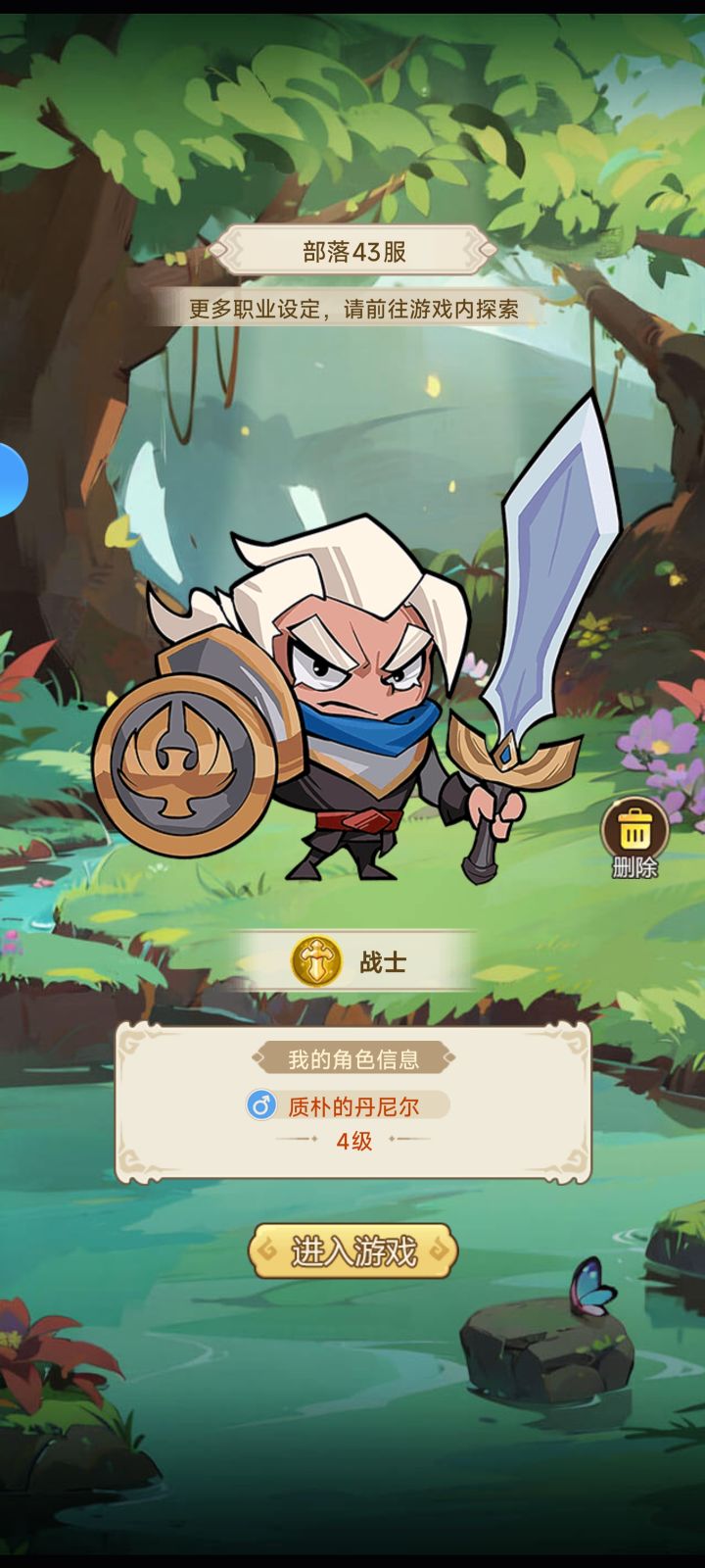 一、画面表现 游戏采用了精美的卡通画风, 色彩鲜艳明快, 角 色设计夸张有趣,像图中战士形象,白发、怒 目、 手持剑盾的造型很有辨识度, 背景的森林场 景也绘制得较为细致,花草树木、溪流等元素营 造出了轻松愉快的游戏氛围, 能让玩家在视觉上 获得不错的体验。 二、 职业设定 (以战士为例) 从角色信息来看, 战士职业的设定比较经典, 手 持剑盾的形象符合传统战士“能抗能打”的定位。 结合类似游戏的