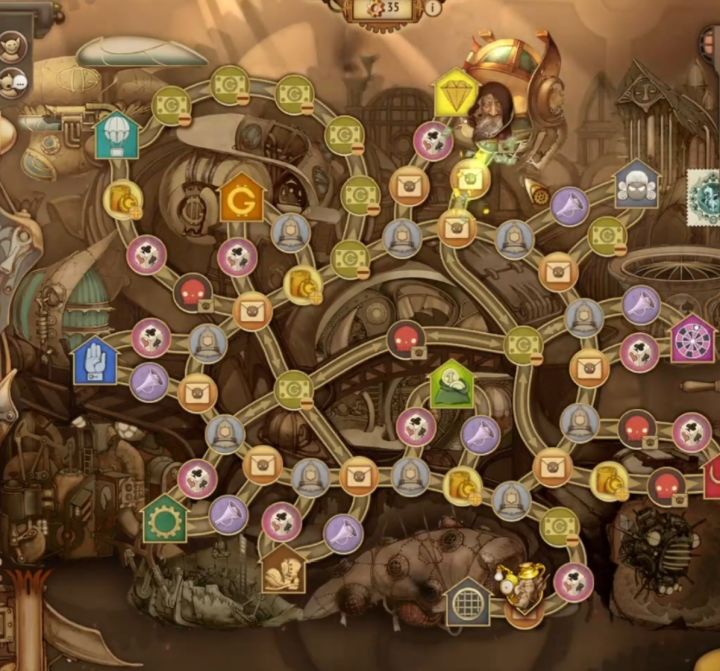 而游戏的地图设计也非常巧妙和有逻辑。分为小站点和大的建筑,比如会赚钱金钱的利息点以及扣除金钱的税务点。检查站,赌场等等。一些手牌可以在这些位置打出效果,但大部分还是在建筑使用居多。可以去坑人,也可以去获得齿轮,也可以去天堂或者地狱做特殊任务来赚取齿轮,让你的手牌发挥最大用处吧