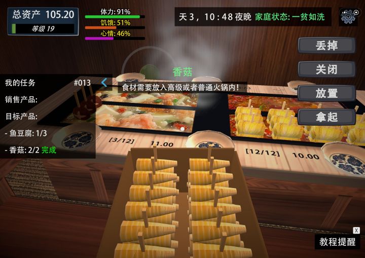 #我的关东煮小铺 #我的关东煮小铺家里装修 #单机游戏 1:怎么说呢,这个是我玩过最好玩的经营游戏了!游戏的自由度也很高,不仅可以装修、养宠物、开店、还可以去餐厅吃饭、去酒吧蹦迪、打车去商场等等。听说后续还会更新夜市和外卖服务之类的玩法,目前很期待。🥺2:赚钱有点慢,我按照游戏论坛上一些网友做的攻略玩了一遍,先降低价格后准备关店时又抬高价格再结账,就是过程有点累,赚的钱确实比之前多了大概两千