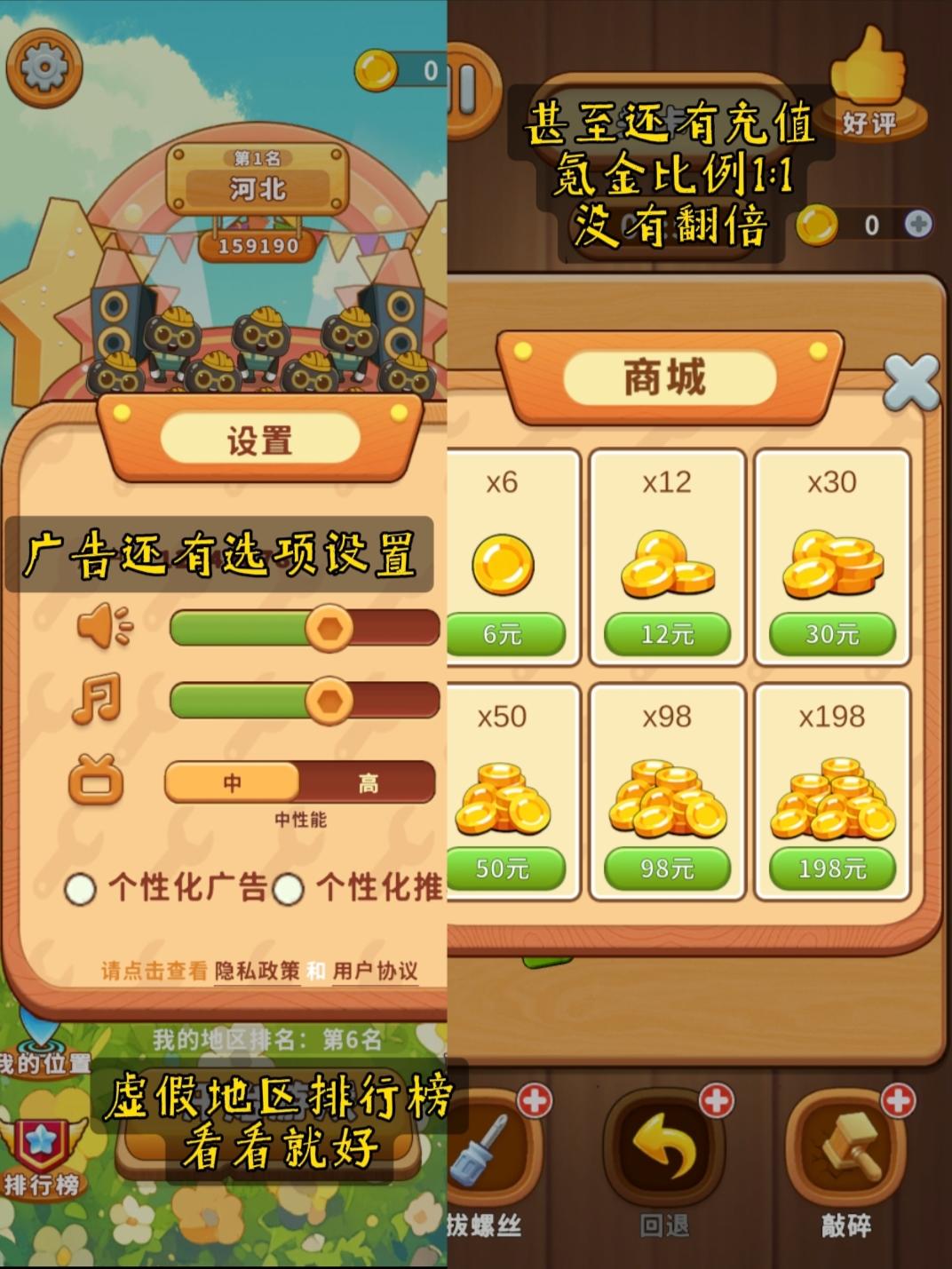 这种bug出来的打螺丝游戏,实属连换皮都没换明白,连基础底层玩法体验都无法令玩家满意,实属令人失望——而且还有氪点和广告,结果还那么敷衍。
