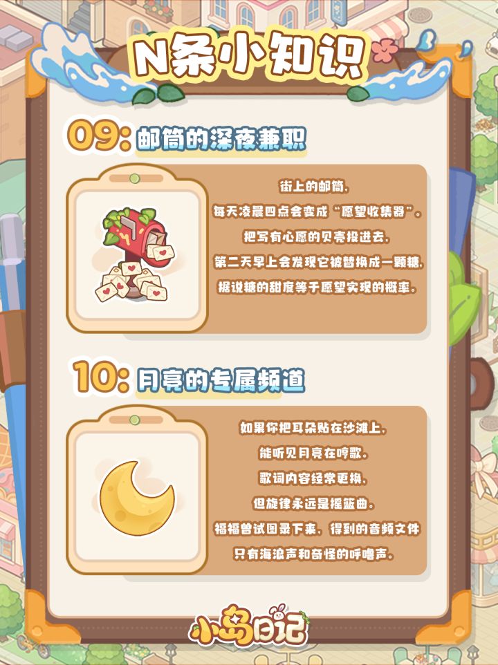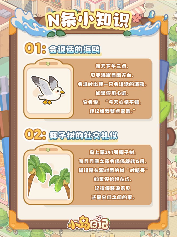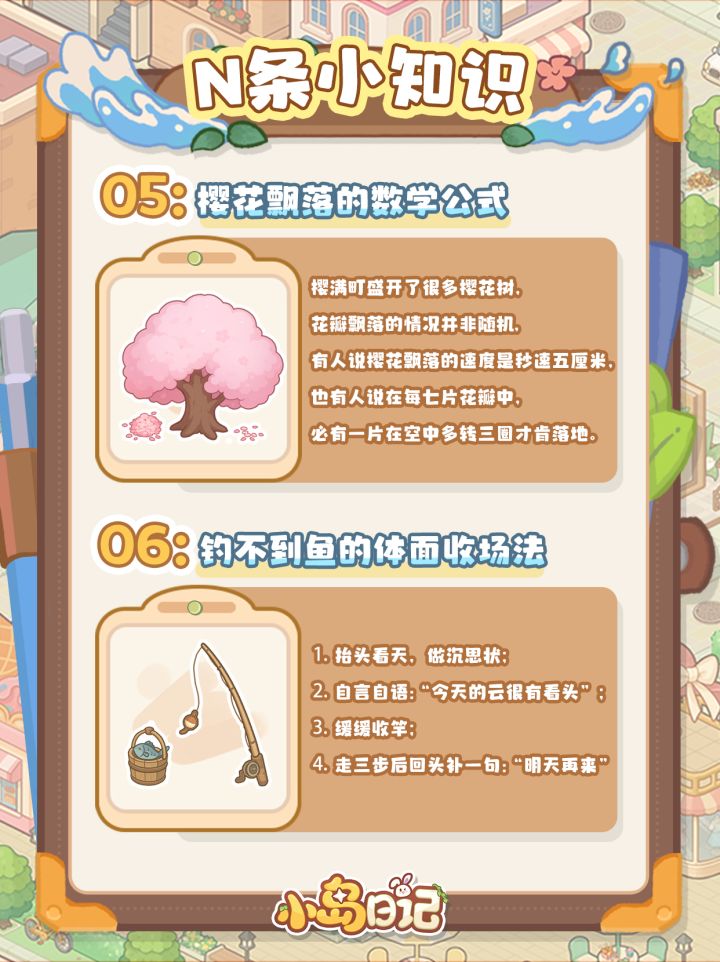 人!福福为大家搜罗了一些“没什么用但看完会很快乐”的小知识——比如说街上邮筒的深夜兼职、樱花飘落的数学公式、还有渔桶里那位从不干活只负责点评的顾问鱼......希望这些“无意义的小事”能够对抗你生活中的焦虑~毕竟在小岛,悠闲快乐才是正经事!(๑•̀ㅂ•́)و✧#发现好游戏 #小岛日记 #小岛日记新游 #游戏日常 #游戏推荐