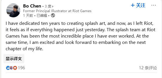 据外媒及游戏媒体报道,《英雄联盟》首席美术插画家陈博于2026年1月底在个人领英账号发文,正式宣布从拳头游戏离职,结束了在拳头长达十年的任职生涯。陈博作为英雄联盟原画团队的核心成员,任职期间主导创作了K/DA、灵魂莲华、心之钢等多个热门系列皮肤原画,同时参与绘制了EDG冠军皮肤、新英雄亚恒、玉剑仙刀妹、Uzi名人堂卡莎等大量玩家熟知的角色与场景美术作品,是英雄联盟美术体系的重要创作者。陈博在领英
