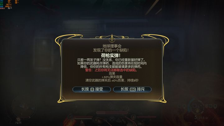 2、全新的缺陷系统表现个人认为并没有这么亮眼;跟大家解释一下这个全新的权限系统,即在玩家游玩的过程中,系统会根据你的游玩习惯,随机给你触发缺陷提示,让你选择是否接受这个缺陷,每一个缺陷触发都带一个增益及一个减益效果,且如果你接受了该缺陷,那么这个增益和减益会同时应用在你的身上,且是不可移除的,会一直伴随着你全程的游玩体验;在我游玩的过程中,触发的缺陷还不到10个,目前只接受了两个缺陷,首先对于这个缺陷系统,我个人认为有两点: