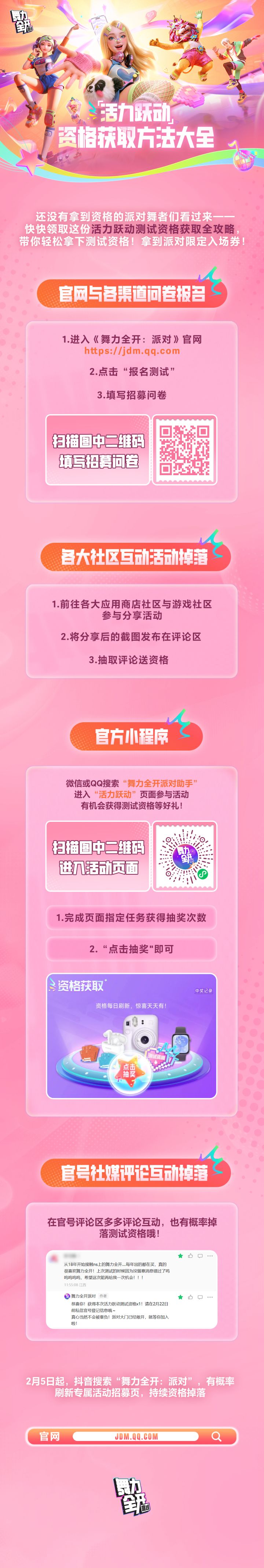 还在苦恼没有测试资格吗?锵锵!【活力跃动】测试资格获取全攻略来啦!手把手带你轻松拿下测试资格!快快加入我们的派对吧!>>活力跃动持续招募中< <◆招募时间:1月30日~2月22日◆点击长图查看【活力跃动】资格获取大全!