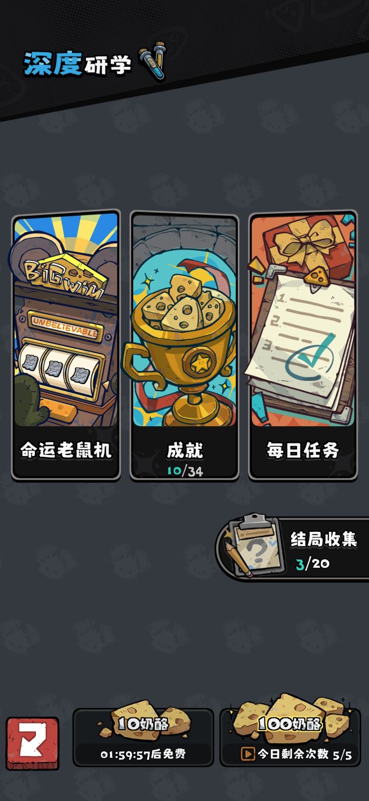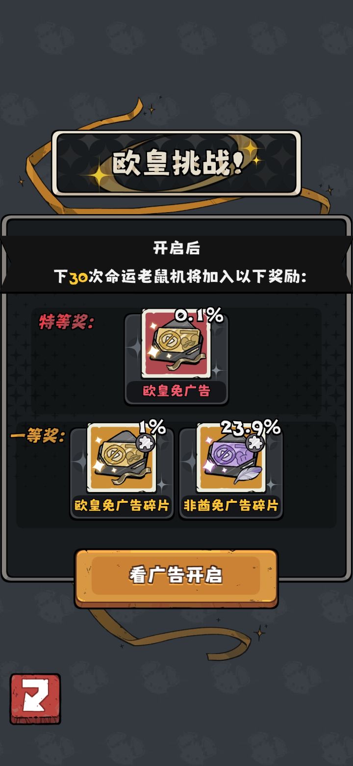 不管你是想走什么流派,资源都是必要的,尤其是走浣熊成立帮派这类路线,而且为了凑上供卡往往不得不看视频来凑双倍卡但是局内看100个视频都不如局外看视频抽免广告卡每天五个广告500个奶酪建议看,我个人差不多玩了两天就有这个卡了,后面就在爽玩个人觉得概率正常,比局内广告划算多了,而且局内广告刷材料的时候特别损体验感搭配乌鸦技能的五张相同卡牌,一次