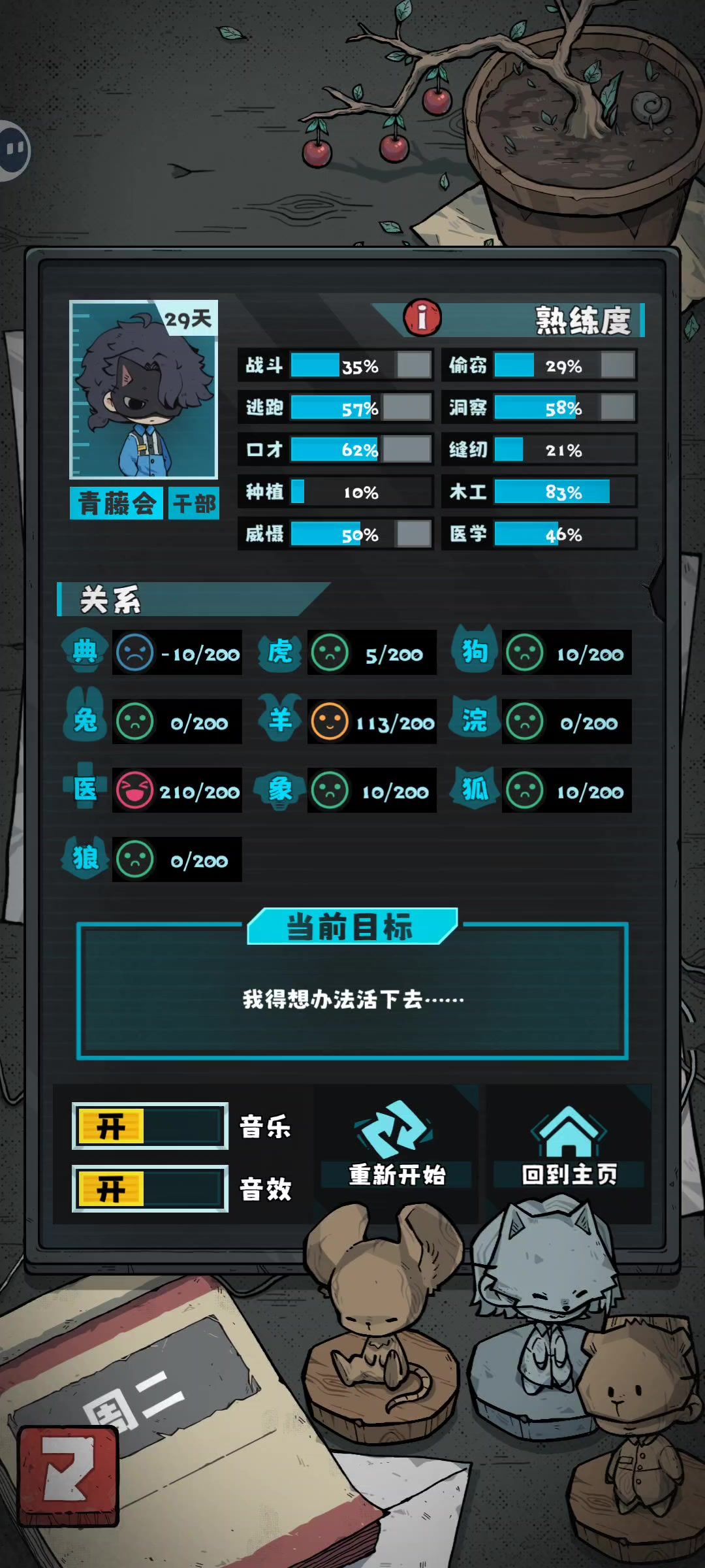 想刷到百分百的但是时间好像有点紧,听说30天还没结局就会是监狱老人结局。 用到了免广卡,加的青藤会,活动需要有擂台。 刷山羊和医生的好感然后要东西刷口才,口才高了以后做药去骗打擂台的人喝,专挑那种1:3甚至1:4的对面下药,然后全压,谨慎点的可以留一点。这样压个两次就几乎是翻十倍。有五十张卡这样压的话过关完全够用,我七十张卡压了三次。然后钱尽量攒到最后一天抽卡(抽的运气差会焦虑),东西最后一天全卖