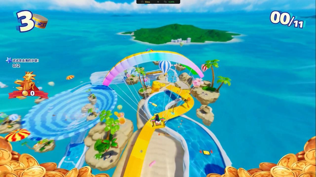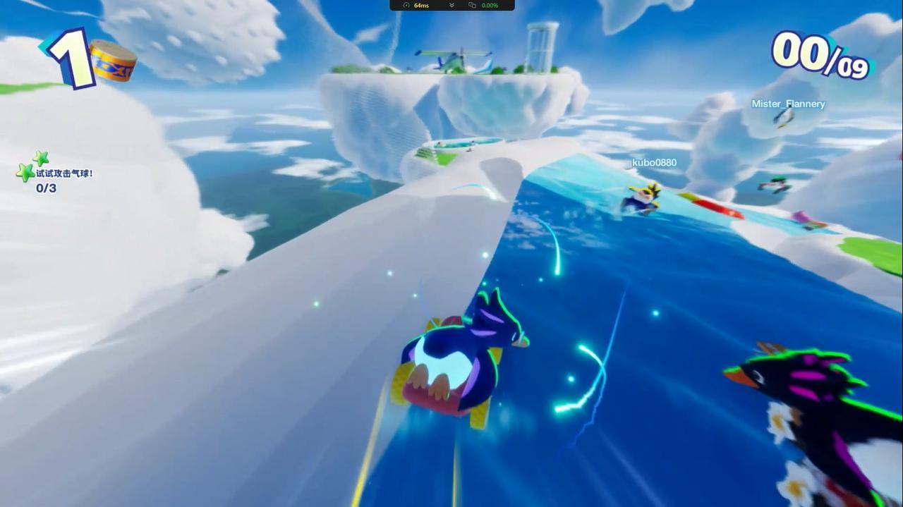 如果没拿到这两种关键道具,我们在落后的时候有没有反超的手段?当然有!那就是在我们从后面靠近对手之后可以按SHIFT键对其进行撞击,碰撞之后我们作为主动撞击的一方可以直接起飞,在空中往前飞行一小段距离,而对手作为被撞的一方却会在原地转几圈,此消彼长之下我们作为后发的一方反而可以获得优势。