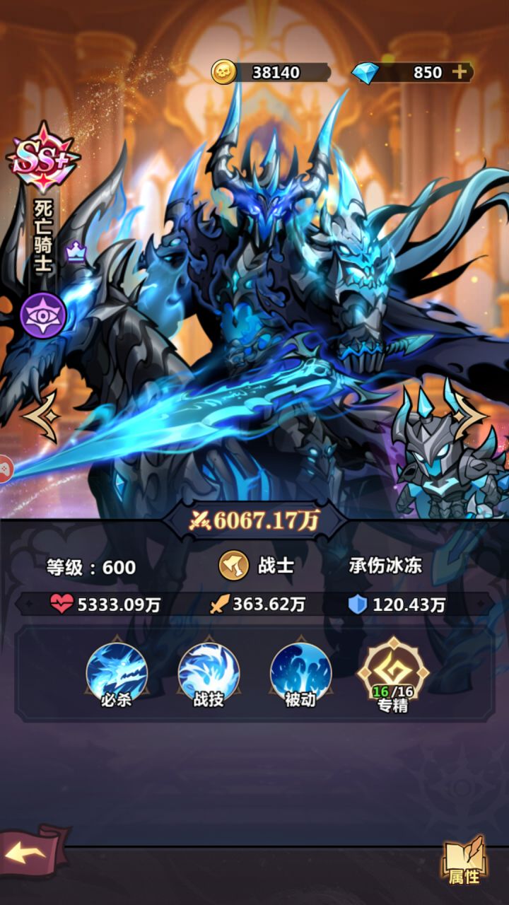 【神兽】:死亡骑士【品质】:SS+【职业】:战士【阵营】:暗影军团(拓张和战争是其主旋律,为征服世界不惜使用邪恶力量)【获取】:试炼达标可领【神兽技能】必杀:冰封龙息战技:凛冬寒流被动:亡者之力【总结】 拥有高额群体攻击,既能输出又具备控制能力,前期容易升星,兼具控制与输出的强大角色,堪称T0级别的控制+输出核心