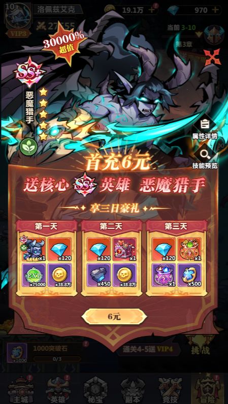 前期阶段推图小技巧来啦!这个阵容在游戏前期具有极快的推图速度,能够帮助玩家快速完成主线任务和副本,提升游戏进度。同时,它也具备一定的PVP强度,在与其他玩家对抗时能够展现出不错的战斗力,保证了在竞技场中的表现。【恶魔猎手】:首充即可直接获得,攻速流的大C角色,不仅输出极高,还能附带流血效果,增强持续输出能力。该角色既容易获取,强度也非常高,是T0级别的输出,在游戏中表现十分强劲,非常适合提升整体