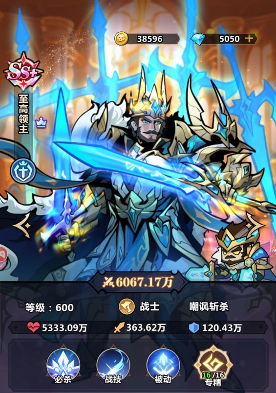 【神兽】:至高领主【品质】:SS+【职业】:战士【阵营】秩序帝国(崇尚正义与荣耀的帝国,历经岁月和纷争的磨炼)【获取】:开局活动赠送【神兽技能】必杀:破军剑魂战技:撕裂一击被动:无尽战意【总结】 作为推图的核心角色,既能抗伤又能输出,血量越低攻击力越强,具备极高的生存与输出能力。