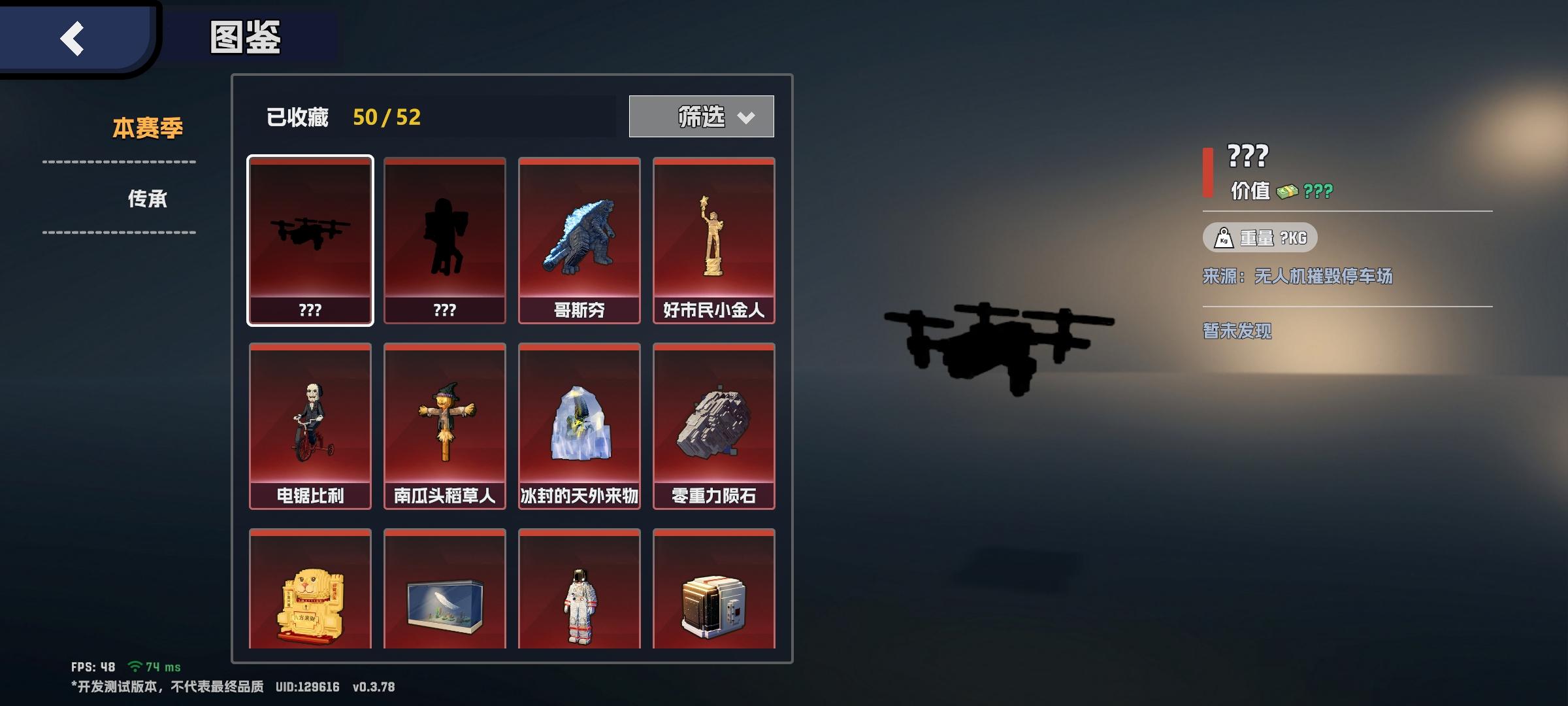玩了三天快100局了,感觉挺幸运的,导弹十来把就出了,哥斯拉五把出,电锯比例四吧,冰封的天外来物,五把出了第一个,然后又是四把,出了第二个,又过了三把,出了零重力化石,稻草人运气不太好,二三十把才出,最让我感到意外的是商场,当时普通的玩了五六把,啥也没出,就没咋玩,后面等级高了,玩了极限,第一把出了土,第二把出了宇航