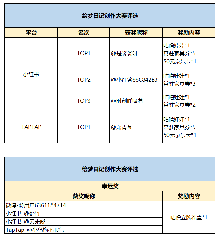 喵!《绘梦日记》创作大赛获奖名单新鲜出炉!ฅ^•ﻌ•^ฅ✨左滑图片看看你有没有上榜叭~超级感谢店长大人们分享的神仙攻略、大师级别的装修设计和满是爱意的游戏日常!咕噜期待未来能有更多店长大人参与到活动中~下次见!✉官方将在公示期(1月7日-1月9日)结束后的7个工作日内联系获奖者,请获奖者及时关注私信以及报名用的QQ消息通知,并于10个工作日内提交领奖信息。#绘梦日记 #绘梦日记公测 #休闲
