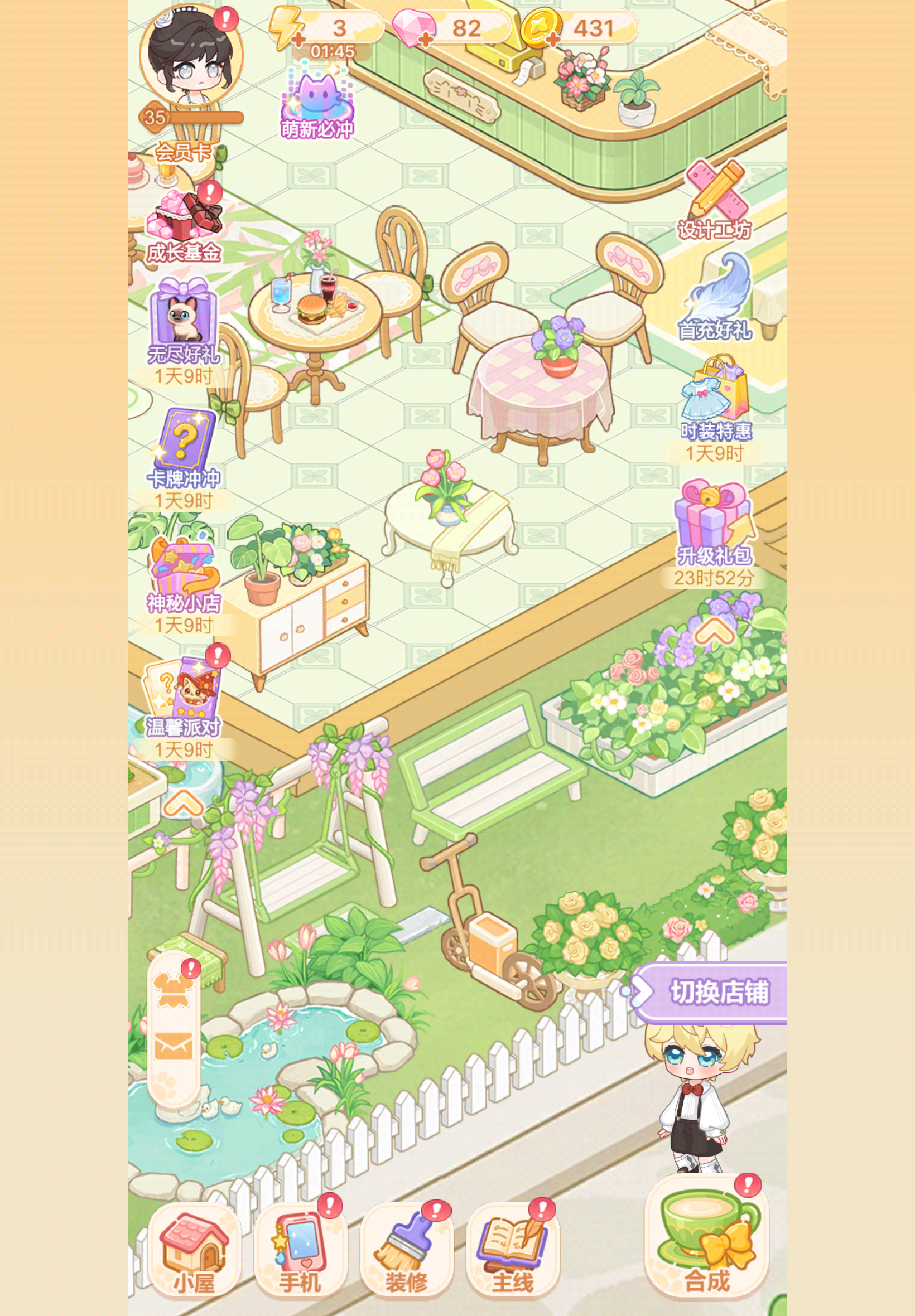 其实总的来说这个游戏对于我还是蛮好玩的,因为我是一个喜欢装修和合成的人,结合非常好玩,其次就是这个订单很难啊,我20级了高级的物品定价很低啊,你可以把升级的价格提高,但是你把高级订单价格变低让我有种这个体力花的不值的感觉,还是说这个集卡好玩,非常有人性,没有非常黑,然后这个衣服能不能多出点,太丑了啊,好看的特别贵,合理吗!我们这种只想微氪的衣服很少啊,啊还有那个抽家具,这个很漂亮哦,我觉得两个家具