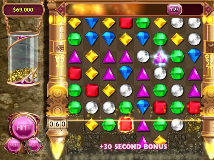 《宝石迷阵3》的游戏模式并非只有单一的消除玩法,也没有按照所谓“消除+”的设计思路去加入一些可能会喧宾夺主的其他玩法,而是在三消核心玩法上做文章。经典、禅境、闪电、任务四大模式,而这四个大模式下有分别包括一个小的隐藏模式,分别是扑克、蝴蝶、冰风暴、钻石矿四个子模式。玩家在四个大模式进行游戏,游戏进程达到一定程度后即可自动解锁大模式下包含的那个子模式。四大模式及其包含的小模式各有不同的玩法,适合有不同体验需求的玩家,设计十分合理。比如经典模式,相当于闯关,玩家在当前关卡的得分足够之后就直接进入下一关,当前关卡中剩余的特殊元素会继承到下一关中,这样关卡之间就有了连贯性,也给玩家一些策略布局的空间,可以将特殊元素的积累到下一关使用来应对之后的关卡。经典模式可以随时退出,进度自动保存,非常人性化。而玩家如果只想放松一下,一边享受消除的快乐一边欣赏动听的BGM,那么可以选择没有任何压力的禅境模式,且在此模式中玩家可以对游戏的视效和音效进行更加细致入微的个性化设置,营造出更加放松身心的体验环境,让禅境模式名副其实。闪电模式则是顾名思义,适合喜欢与时间赛跑的玩家,在短短的一分钟里不断挑战自己眼力与操作的极限。而任务模式则更加具有趣味性,这个模式其实又包括了八种不同玩法的小游戏,将三消的核心玩法与目标各异的小游戏的巧妙结合,可谓匠心独运。后世的很多三消手游,其中不少特殊玩法其实都有《宝石迷阵3》中任务模式小游戏的影子。能将三消的核心玩法设计出这么多花样,实属不易。