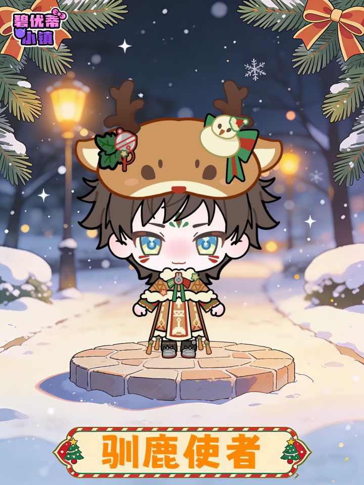 姓名:驯鹿使者种族:雪原旅人身份:雪国信使性格:元气、机灵、爱逞强、嘴硬心软、行动派【居民档案】驯鹿使者背着风雪来到小镇,头顶那顶“驯鹿帽”像是他的通行证——角上挂着铃铛与冬青,走一步就叮当一声,像在提醒大家:节日要开始啦。他自称是雪国的信使,负责把“第一份祝福”送到每个还没准备好的心里。白天常在广场和街角穿梭,检查彩灯、系紧缎带、把歪掉的装饰扶正;到了傍晚,他会把小小的雪人徽章别在需
