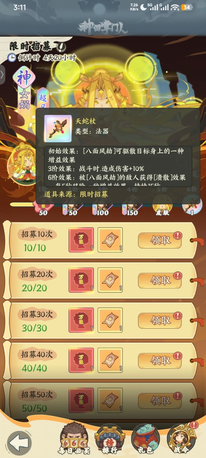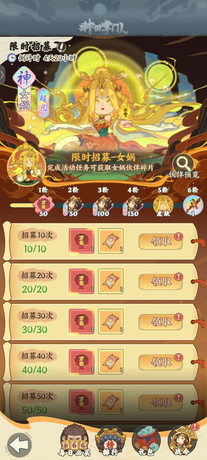 明天开服第七天要开李白,天界攻城好像第八天开。神话卡: 1,猴子神话需要冲128,放弃。 2,祝融抽到12星就停手了,留票抽下一个神话。 3,金乌白嫖每天活动慢慢升。 4,明天开李白,不知道能不能白嫖拿到。 5,后面轮换神话金灵,金蝉子,神农就留着票慢慢抽。评价: 可以消遣,首充六元玩,游戏节奏慢,也没被榜一拉开多少。目前资源缺口巨大,升级和敲装备的材料根本不够,打秘境还需要两个队