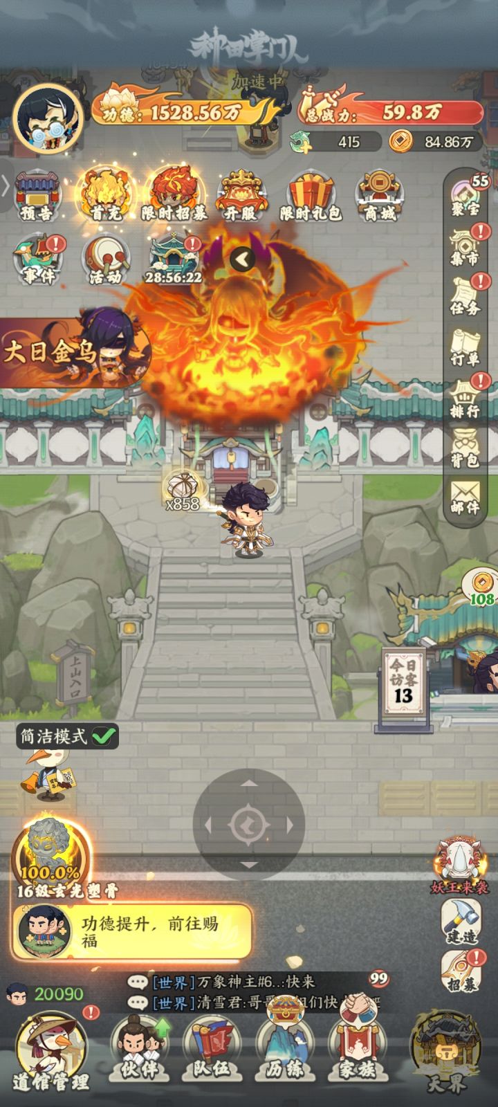 #种田掌门人 大家好,我又来了今天是开服的第二天,相信各位零氪的的玩家,卡在了金乌吧,功德等级基本都18级了。奈何战力不够同样本人也是如此。微氪玩家,应该会好些。至于大佬应该备战天界。不知道,各位都抽到祝融了吧,记得收手哦。玉和招募卷攒起来。下一次七天限时活动是金灵圣母(神品超凡,前排肉盾,辅助型英雄)言归正传,咱们今天一起盘点一下,《每天能白嫖到的奖励》